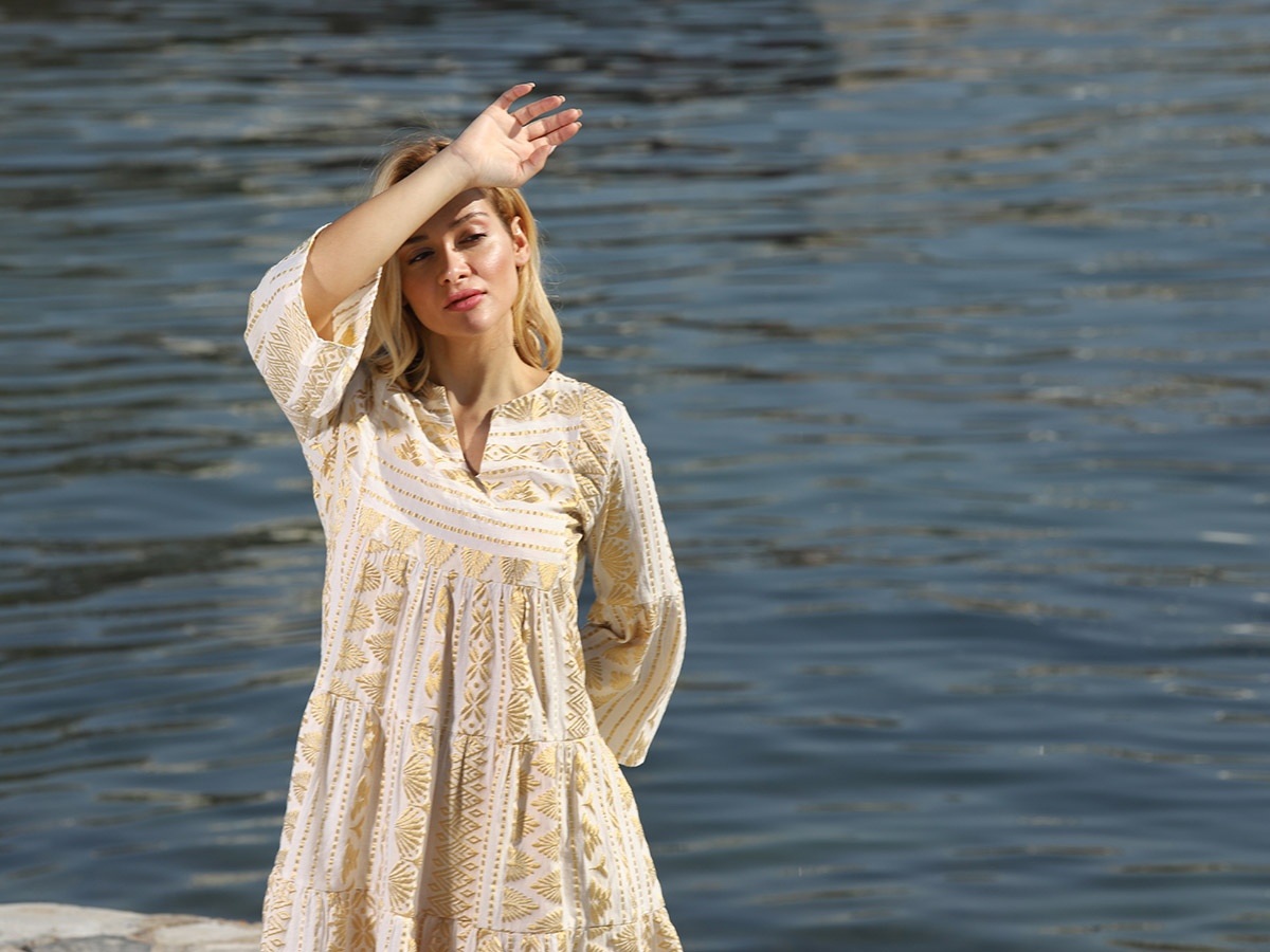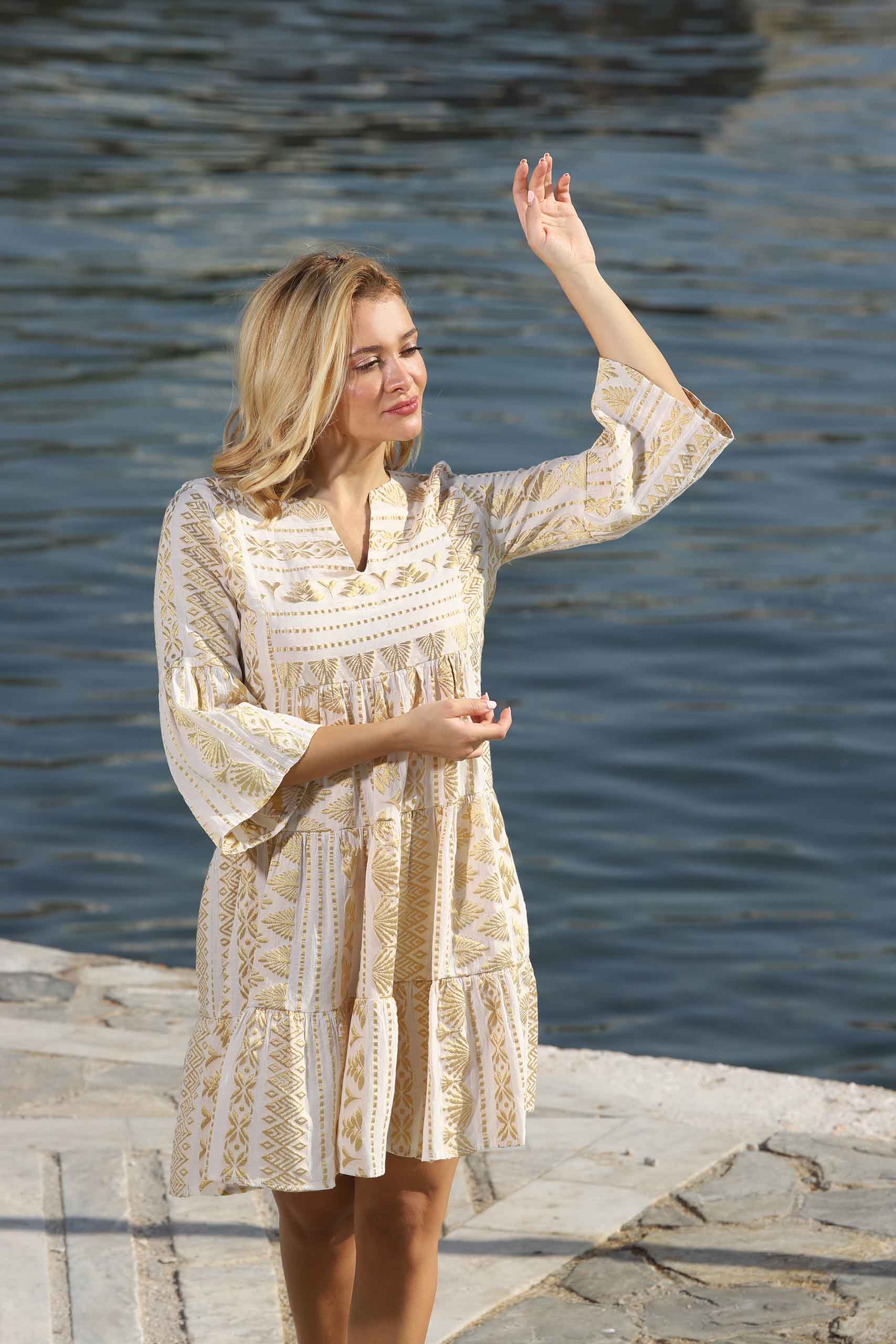 100% COTTON DRESS, SUPERIOR QUALITY, STYLISH AND COMFY WITH DELICATE EMBROIDERIES, THREE QUARTER SLEEVES, MADE IN GREECE