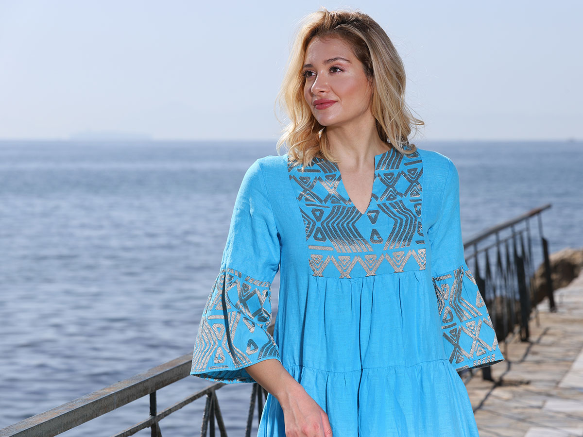 100% LINEN DRESS, SUPERIOR QUALITY, MADE IN GREECE, COMFORTABLE AND STYLISH, FEATURING RUFFLED DETAILS ON THE SLEEVES, WITH DELICATE EMBPPROIDERIES